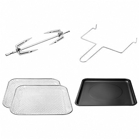 • 5-piece accessory kit with rotisserie spit and lift tool, 2 air fry baskets, and a drip tray