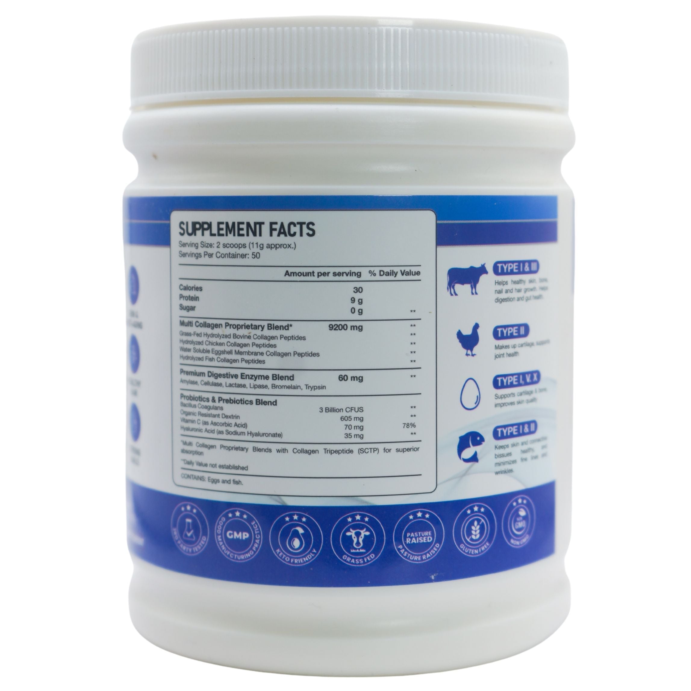 Collagen Peptides: Unflavored collagen powder that supports skin elasticity, joint health, and hair and nail strength.